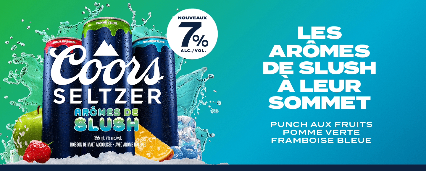 Découvrez nos produits Slush pomme verte à 7 % Slush punch aux fruits à 7 % Slush framboise bleue à 7 % Arôme de slush à la cerise Arôme de slush à l’orange Arôme de slush au raisin Bonheur à la Fraise Rêves à la pêche à combiner Bonheur à la fraise à combiner Ananas colada Mangue ensoleillée Daiquiri au melon d’eau La pêche Punch Aux Fruits Fraise Framboise Bleue Suivez-nous sur Instagram @CoorsSeltzerCA